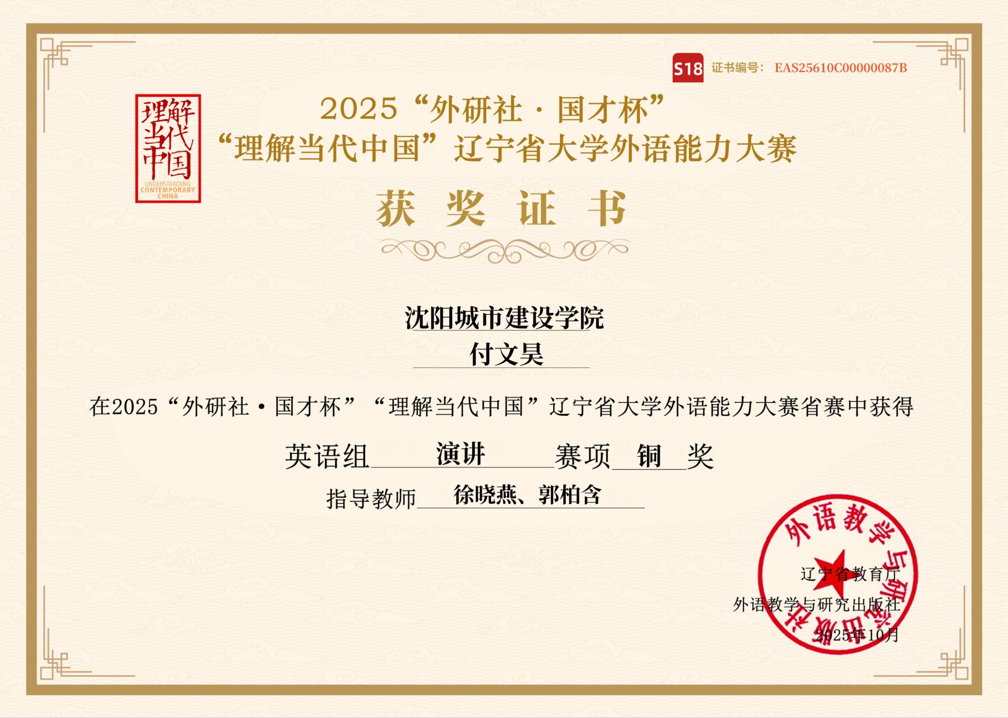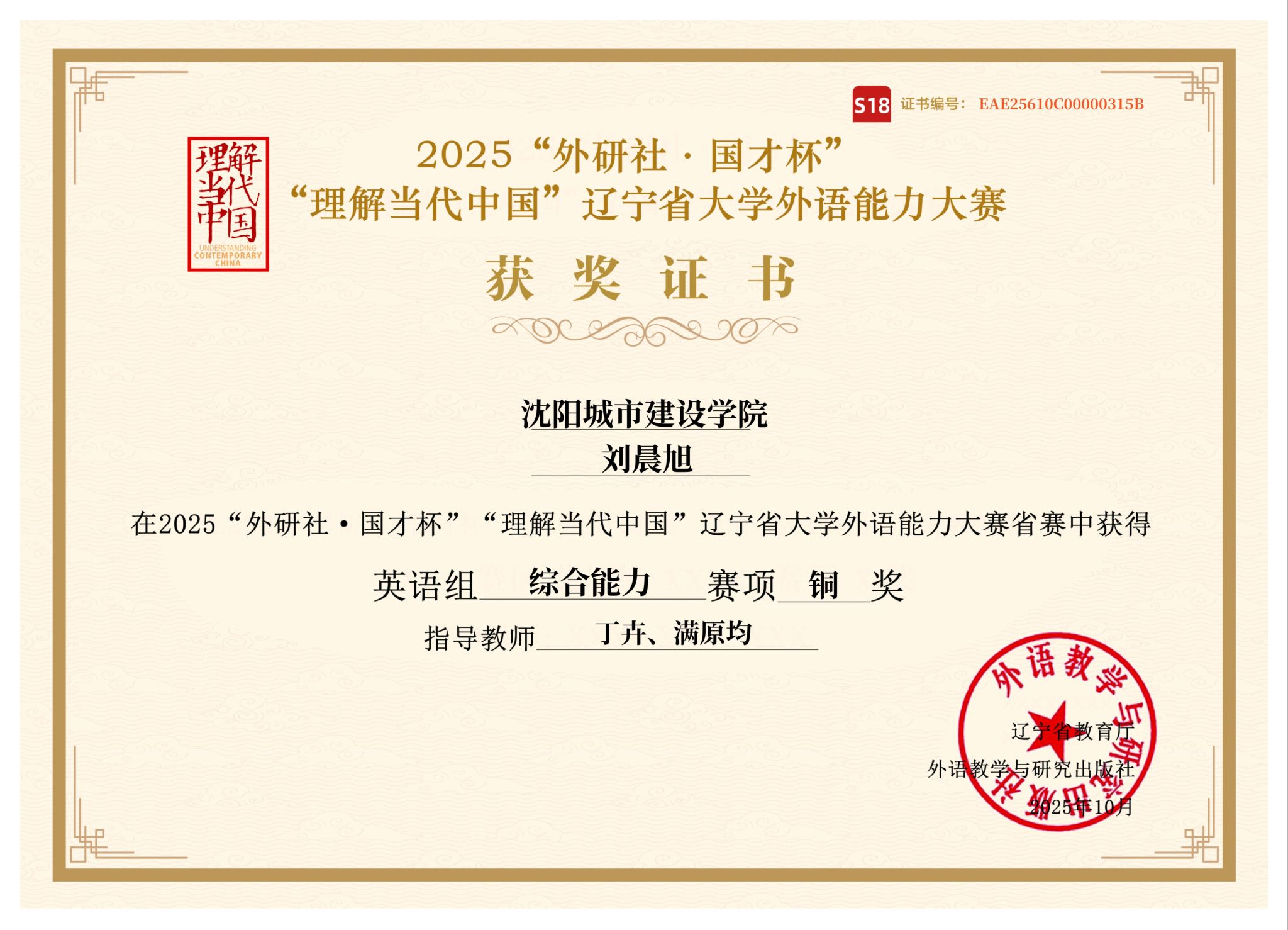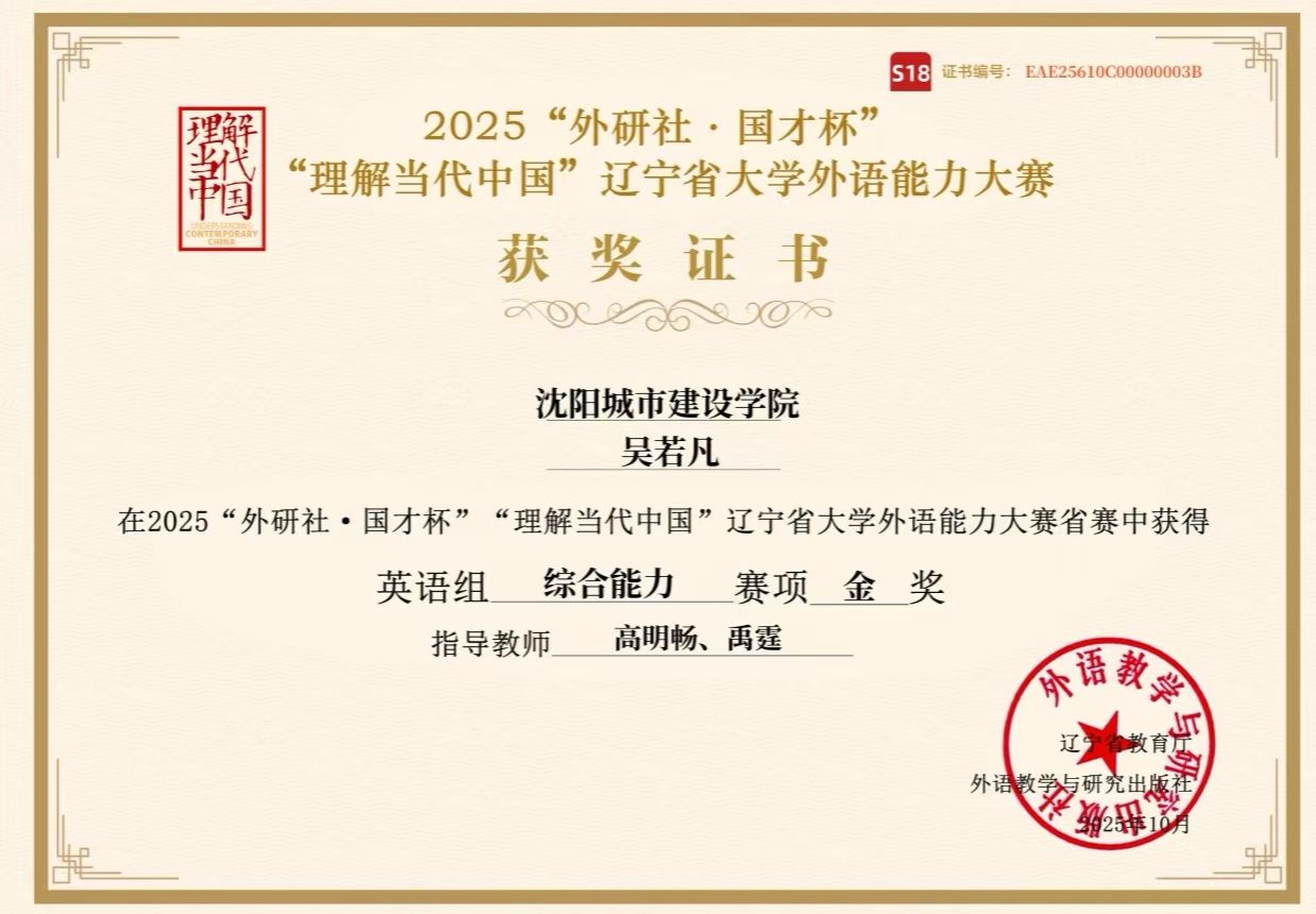 10月25日,2025年“外研社·国才杯”全国大学生外语能力大赛(英语组)辽宁省赛区比赛圆满落幕。我校8名参赛学生在与全省高校选手的激烈角逐中表现优异,共斩获省级金奖1项、铜奖3项及优胜奖4项。此次折桂是我校自2019年首获省赛金奖后,时隔六年再次夺得这一高级别奖项,标志着我校在外语人才培养质量上实现了新的突破。
