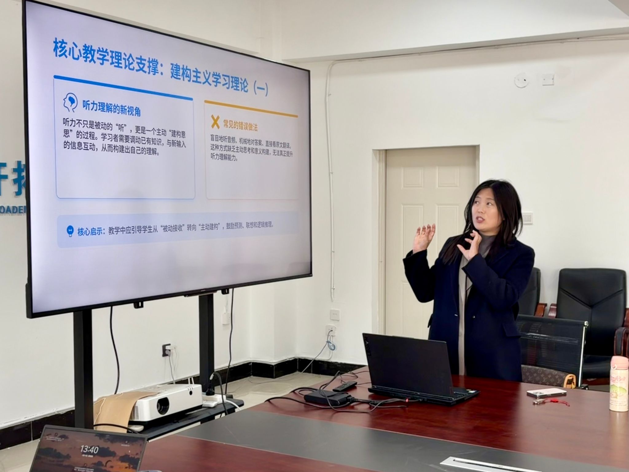关娇老师以B班四级教学痛点分析为切入点,精准提炼出 “听不懂、不爱学、不会学”三大核心问题,并结合输入假说、刻意练习、建构主义、元认知策略四大理论,系统阐述了低起点学生语言习得的底层逻辑。她建议教学应遵循“i+1”可理解输入原则,为学生提供“跳一跳够得着”的学习内容;通过真题精训、技巧拆解、全真模拟落实刻意练习,引导学生从被动刷题转向主动提升;依托建构主义理念,推动学生从被动听音频转向主动建构语义、复盘逻辑;借助元认知策略,帮助学生制定个性化复习计划、建立错题闭环,实现从“被动学”到“会学”的转变。关娇老师还现场分享了四级自我规划复习评估表,为学生分阶段备考、每日任务落实提供了清晰指引。